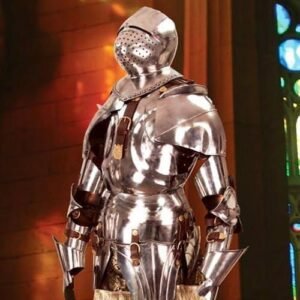 Las armaduras de placas se popularizaron a mediados del siglo XIII, seguidas por las armaduras de placas completas a finales del siglo XIV. Alemania e Italia fueron los principales centros de producción de armaduras. Estas se fabricaban principalmente en estilo gótico. Esta réplica reproduce el diseño gótico italiano. Ofrecía gran protección y comodidad, y fue muy apreciada en toda Europa. Proporcionaba una superficie redondeada tanto a la lanza como a la espada. Esta armadura está hecha de acero de calibre 18 y se completa con un cuerpo esquelético completo y un faldón decorativo. Incluye correas de cuero. El pedestal de madera le otorga una atractiva altura de 2,13 metros.